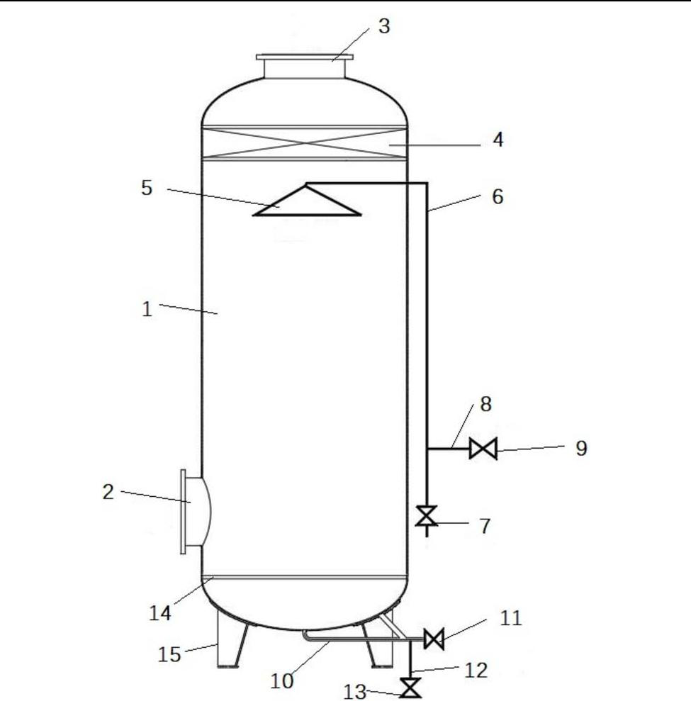 實(shí)施例的一種合成氨原料氣精脫硫凈化裝置,包括水洗分離裝置主體、循環(huán)水進(jìn)水系統(tǒng)以及循環(huán)水出水系統(tǒng);其中水洗分離裝置主體包括:分離器罐體1、支撐腳15;所述分離器罐體1下部設(shè)置有氣體進(jìn)口2;所述分離器罐體1下部設(shè)置有水位監(jiān)控14裝置;所述分離器罐體1 上部設(shè)置有絲網(wǎng)除沫器4;所述分離器罐體1頂端設(shè)置有氣體出口3;所述循環(huán)水進(jìn)水系統(tǒng)包括:水洗噴頭5、循環(huán)水進(jìn)水管6、進(jìn)水電磁閥7、原料氣吹灰管8、吹灰管電磁閥9;所述水洗噴頭5設(shè)置在絲襪除沫器4下端,設(shè)置在分離器罐體1內(nèi)部;所述循環(huán)水出水系統(tǒng)包括:循環(huán)水出水管10、出水管電磁閥11、原料氣反吹管12、反吹管電磁閥13;所述循環(huán)水出水系統(tǒng)設(shè)置在分離器罐體1底端;所述支撐腳15焊接在分離器罐體1底部外表面。