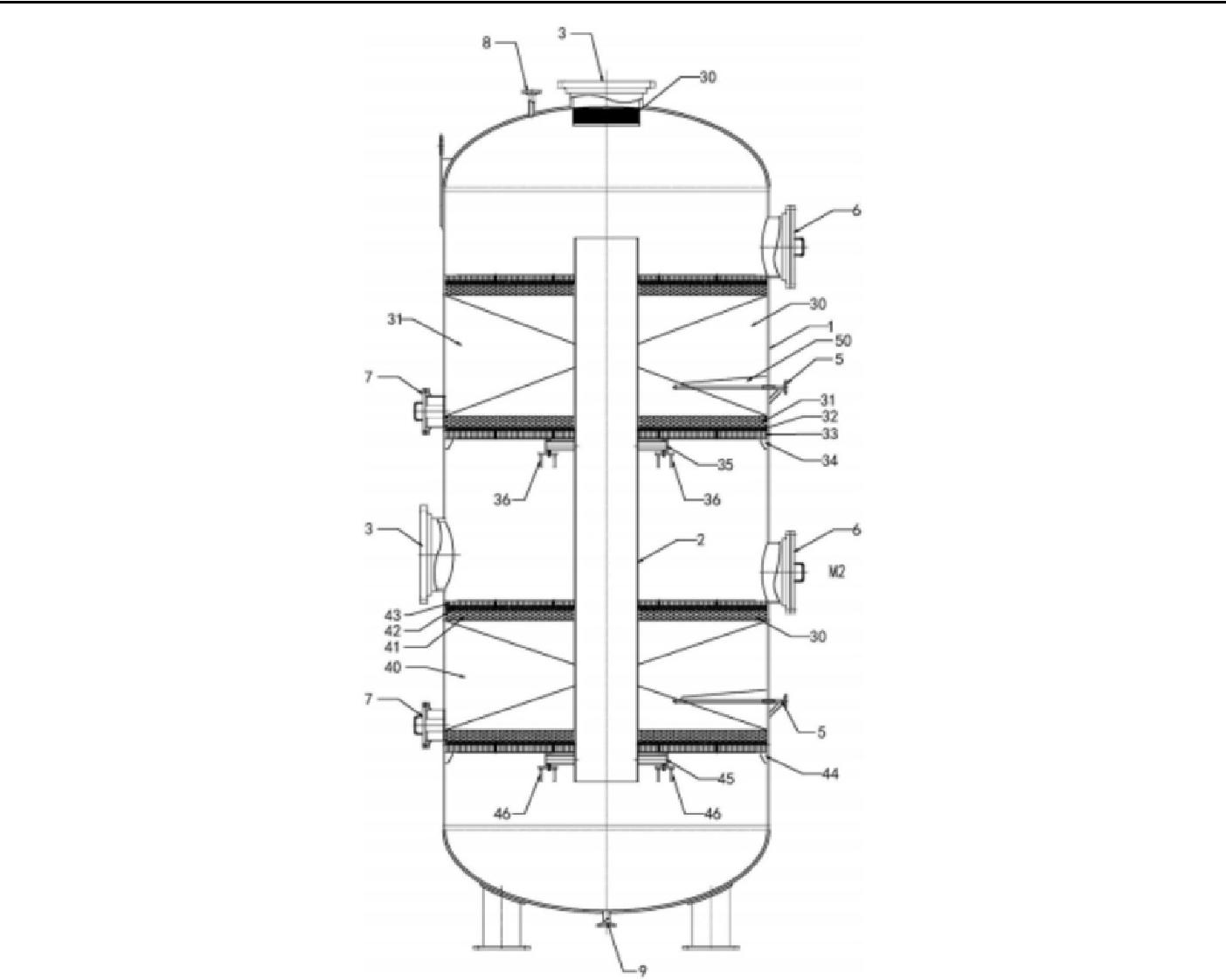 硝酸尾氣中氮氧化物的氮氧化物(NOx)主要由一氧化氮(NO)和二氧化氮(NO2)組成,NOx的處理主要是以氨做還原劑在催化劑的作用下將尾氣中的NOx選擇性還原為N2和H2O,達(dá)到脫除NOx的目的。由于硝酸尾氣排放量大,壓力大,不能達(dá)到使尾氣與氨在還原劑的作用下充分接觸,而降低轉(zhuǎn)化效率,因此目前需要一種能滿足要求能夠使尾氣與氨在還原劑的作用下充分接觸達(dá)到有效處理尾氣中氮氧化物的目的