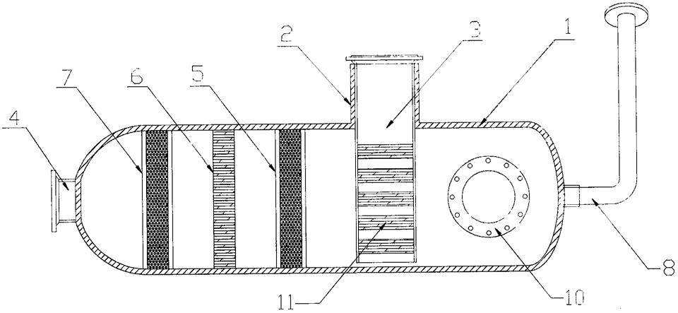 本發(fā)明在工作時(shí),帶液氣體進(jìn)口2中進(jìn)入混合有水汽的原料液體,原料液體在葉片式進(jìn)料分布器3的作用下均勻的流入分離裝置主體1中,然后原料液體依次流經(jīng)金屬絲網(wǎng)除沫器5、葉片除沫器6和復(fù)合材料絲網(wǎng)除沫器7消除泡沫以及進(jìn)行水氣分離,經(jīng)過金屬絲網(wǎng)除沫器5、葉片除沫器6和復(fù)合材料絲網(wǎng)除沫器7之后的原料液體所含有的水汽大幅度的降低,實(shí)現(xiàn)了下一步加工的需求。